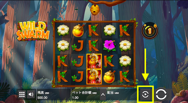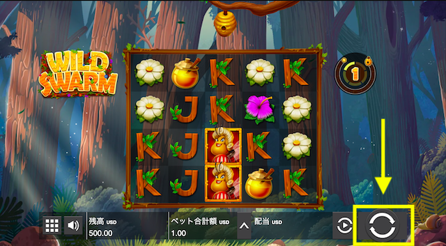 ワイルド・スウォームでは、スピンボタンを毎回押さなくてもプレイできる『オートスピン』機能が搭載されています。