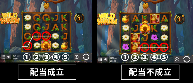 ワイルド・スウォームでは、左からペイライン上に2〜3個以上シンボルが揃うと配当成立となります。