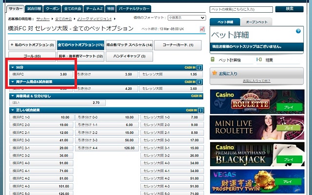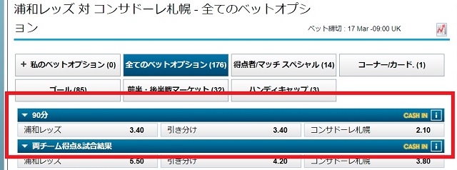 1つの試合で賭ける対象(オッズ)は様々です。どのオッズに賭けるかを決めて、オッズをクリックしてください。