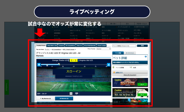 ライブベットは、リアルタイムで開催されている試合にベットする賭け方です。