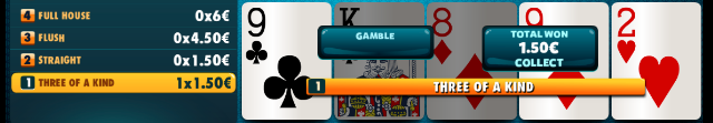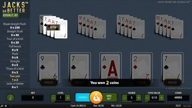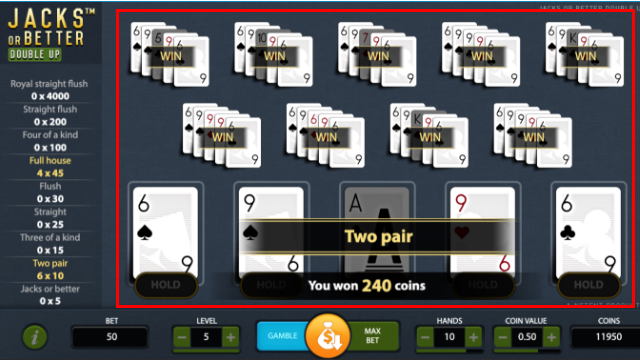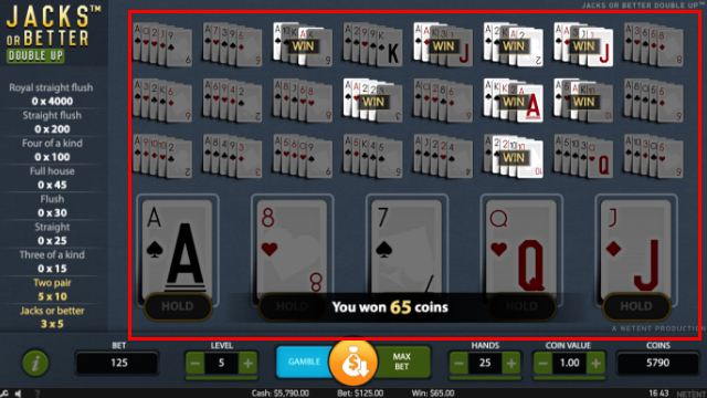 ビデオポーカーは、対人ポーカーとは違い役を揃えるだけで配当をもらうことができます。