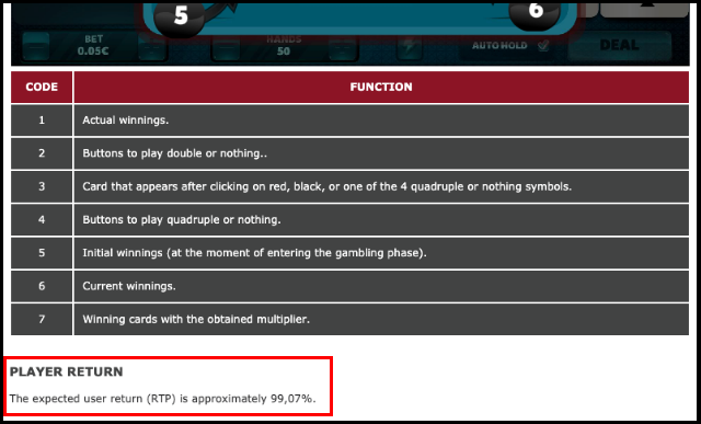 上記のビデオポーカーではRTP(還元率)99,07%なので、控除率(ハウスエッジ)は0.93%となることが確認できます。