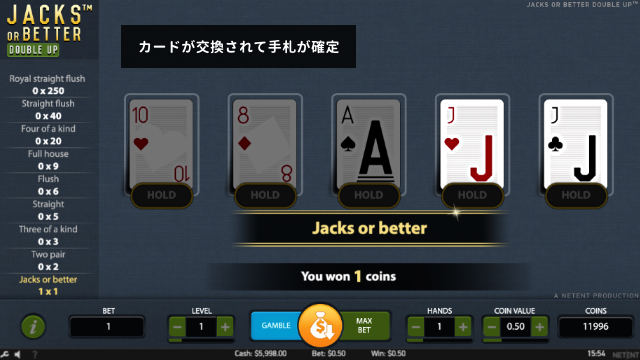 ビデオポーカーのカード交換は、基本的に1度で終了するためこの交換後に勝負が決まります