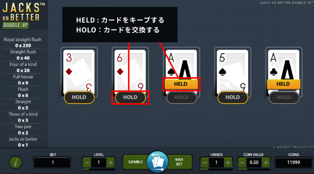 このフェーズでは役を作るために捨てるカードと残すカードを選定します。カードを変更したい場合は『HOLD』のマークが付いた状態にします。逆に残したい場合は、『HELD』のマークが付いた状態にします。