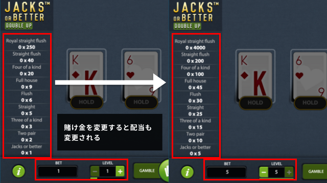 LEVELは賭け金の倍率を変更する項目で、例えばLEVELを5にすると、各役の配当も5倍になるため、40倍だった「Straight Flush」がなんと200倍まで配当が上昇します。