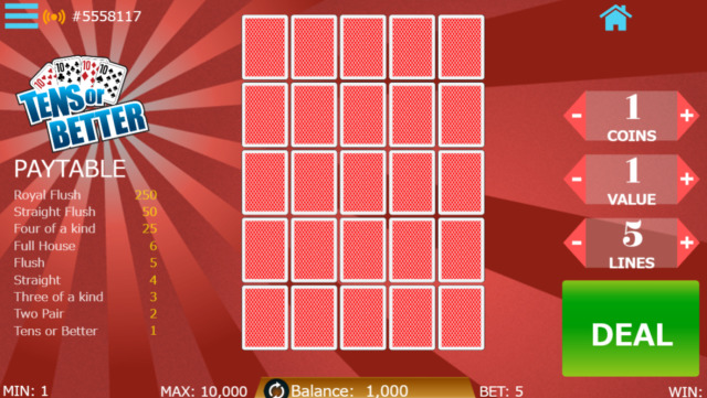 テンズ・オア・ベターは、ゲーム名の通り「10」以上のカード(10,J,Q,K,Q)でハンドが揃うと配当がもらえるビデオポーカーです。