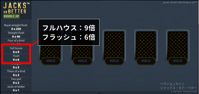 通常のジャックス・オア・ベターではフルハウスが8倍、フラッシュが5倍と配当が決められていますが、フルペイ機種はフルハウスの配当が9倍、フラッシュが6倍と配当が高く設定されていることが多いです。