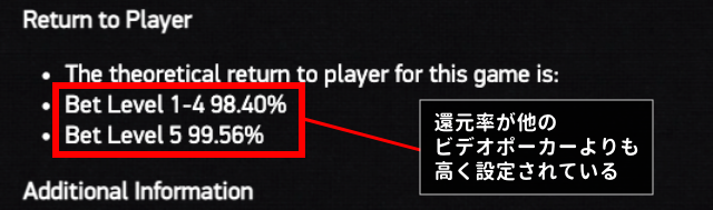 ビデオポーカーには様々な機種がありますが、控除率(ハウスエッジ)はだいたい約0%〜5%ほどになると言われており、多くのオンラインカジノゲームではヘルプから還元率やペイアウト率を確認できます。