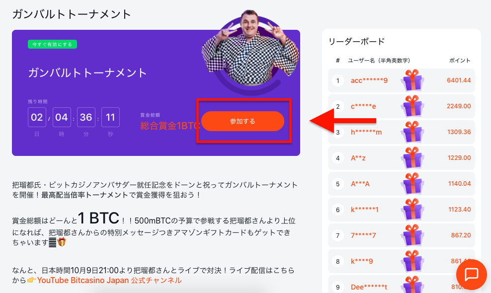 | ガンバルトトーナメント | 10/5〜10/9 | 1BTC |