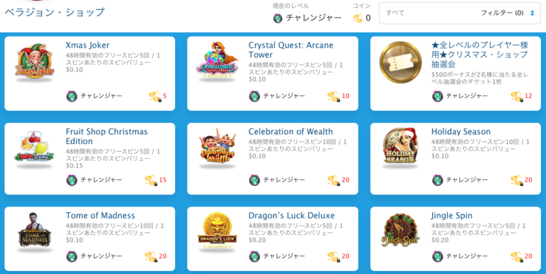 ベラジョンカジノにおけるコインは保有する量が増えることでレベルが上昇し、さらに溜まったコインはショップでアイテムを購入する際に使用できます。購入できる主なアイテムはフリースピンやスピンクレジット、ボーナスキャッシュとなっていて、プレイヤーのレベルによっても購入できる内容は異なります。