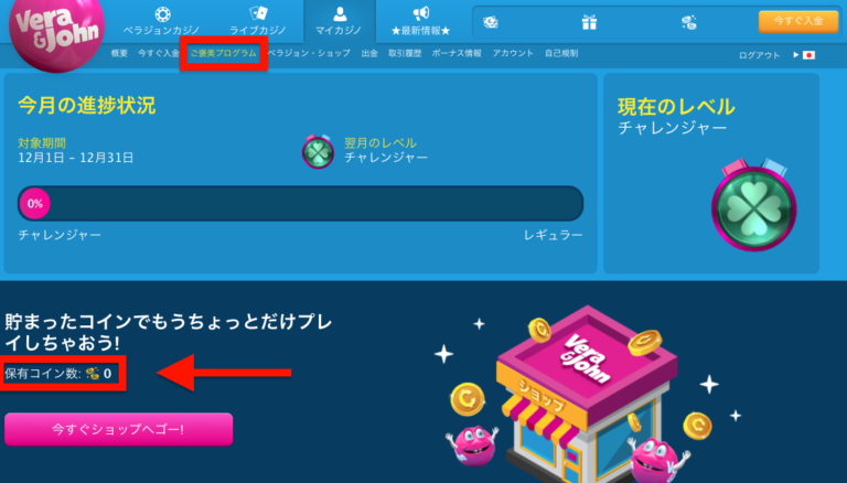 いくらコインを獲得したかはベラジョンカジノの「ご褒美プログラム」のページからチェックできます。