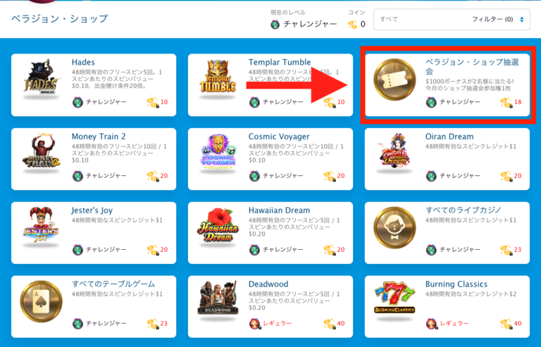 - コインを使ってベラジョン・ショップで専用アイテムを購入すると抽選会に参加ができます。