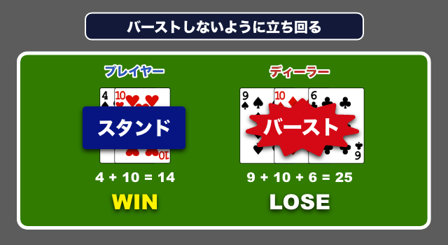 ブラックジャックで勝つ方法としては、ディーラーより合計「21」に近づけることばかり注目されがちですが、バーストしないよう立ち回るのも勝つうえで重要な戦略の1つです。