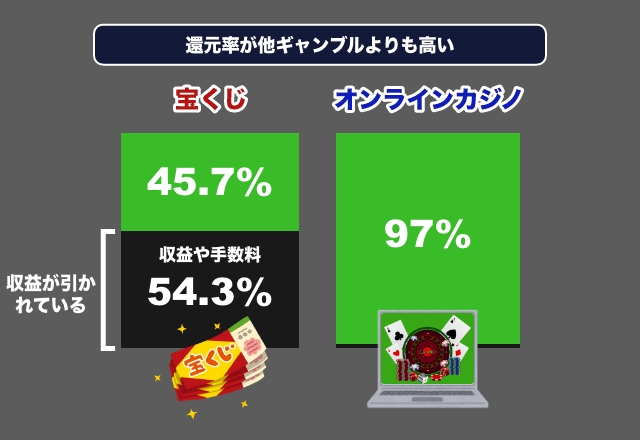 それぞれ比較すると、オンラインカジノの圧倒的な還元率の高さがお分かりいただけるのではないでしょうか。簡単に大当たりが出ない宝くじの倍以上あります。