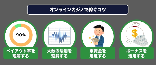 - オンラインカジノで稼ぐコツ(還元率・大数の法則・軍資金など)