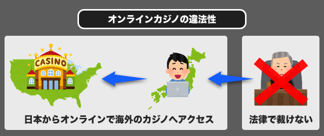 オンラインカジノが合法とも違法とも言い切れない理由は、日本の法律に海外オンラインカジノで遊ぶことを取り締まる法律がないからです。