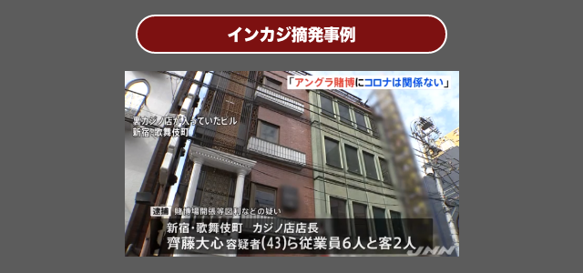 インカジは営業許可がおりていない店舗であり、国内で認められていない賭博を客にサービスとして提供するので、完全に違法です。店舗従業員だけでなく、カジノゲームで遊んだプレイヤーも摘発対象となります。