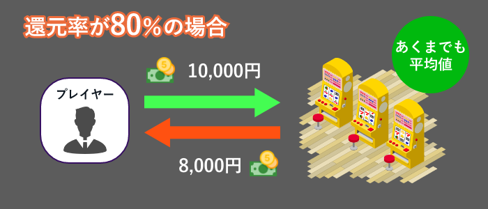 ここでプレイヤーの心理を考えてみましょう。還元率が高いほど、当然「勝てる!」という気持ちになるものです。ただし、還元率はあくまで「平均値」であることに注意してください。大量のゲーム数をこなし、その勝敗をトータルで平均化したときに出てくる配当金、その割合が還元率となって示されます。