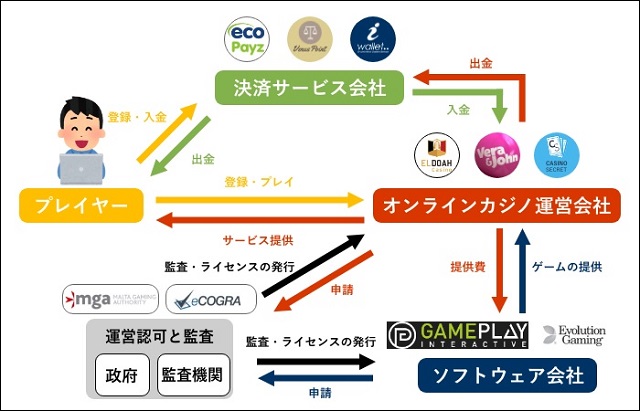 それぞれ専門機関から審査を受けてライセンスを取得しており、オンラインカジノ運営会社はプレイヤーにゲームで遊ぶ場を提供することで、ソフトウェア会社はオンラインカジノにゲームを提供することで収益を上げています。
