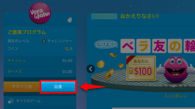 それでは実際にオンラインカジノに出金する流れをみていきましょう。例ではベラジョンカジノの画像を使用しますが、出金手順はどこのオンラインカジノでもほとんど同じです。
