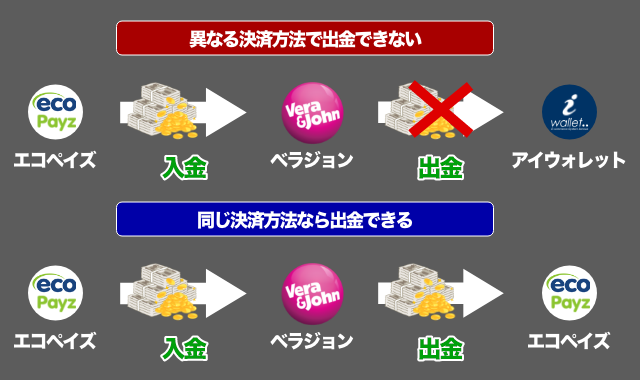 どこのオンラインカジノでも、原則入金に使用した決済方法でしか出金できません。