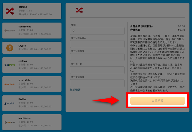 最後に出金(送金)をクリックすれば、オンラインカジノでの出金手続きは完了です。