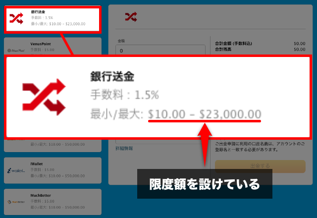 最大出金額と最小出金額は各オンラインカジノごと、各決済方法ごとに決められています。