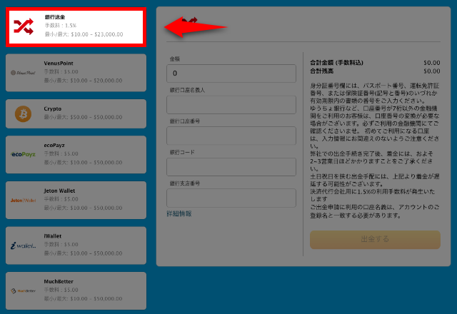 入金で使用したのと同じ決済方法でないと出金できないので、銀行送金で出金したい場合は銀行入金、ビットコインで出金したい場合はビットコイン入金をしましょう。
