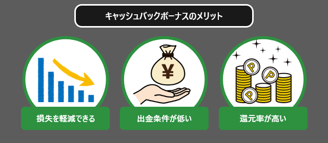 ゲームで負けた一部の賭け金が還元される「キャッシュバックボーナス」。オンラインカジノにあるボーナスの中では比較的還元率が高く、出金条件は低いため現金化しやすい部類です。