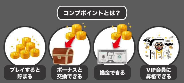 コンプポイントはオンラインカジノで獲得できるポイントです。どんなポイントなのか理解できるよう特徴を以下4項目に分けて解説します。