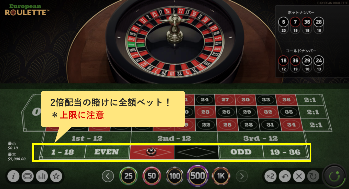 コツコツ戦略ではうまくいかないと感じたら、残りのボーナス全額をルーレットの赤黒賭けやバカラのプレイヤーなどに賭けて一気に増やす方法を狙ってみましょう。もちろん負ければ終わりですが、勝てたら残高が一気に増えるので出金条件クリアは近づきます。