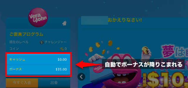 出金条件をクリアすると、ボーナスとキャッシュが別々にカウントされる分離型のオンラインカジノであれば、ボーナスおよび勝利金がキャッシュ残高に移し替えられ、ボーナス残高が0になります。