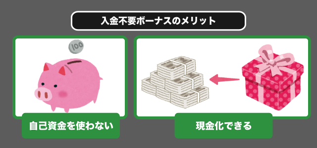 - 入金不要ボーナス(登録ボーナス)は登録するだけで貰える