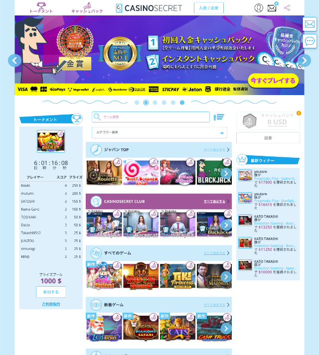 カジノシークレットは業界初、出金条件がないキャッシュバック制度が好評のオンラインカジノです。ランキング1位に輝いた理由は、「手数料無料」と「入金の速さ」です。