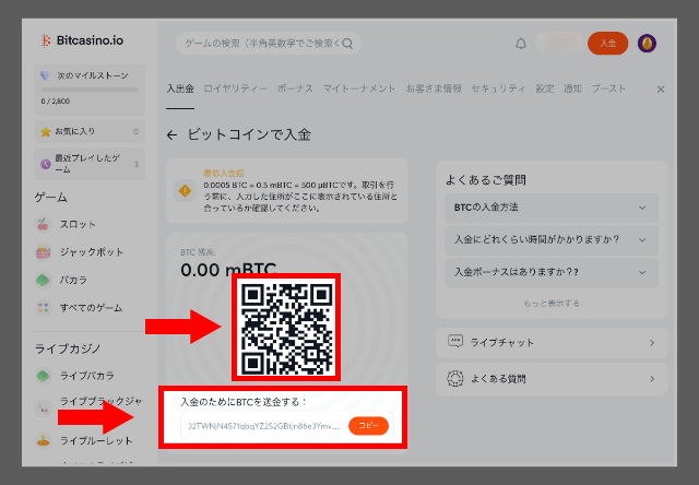 ビットカジノ入金画面では、ビットコイン入金用のQRコードと専用アドレスが表示されます。