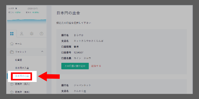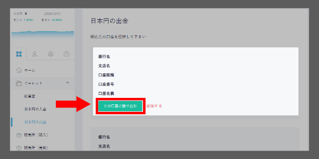 換金処理が完了したら、次は、取引所から銀行口座に日本円を送金する手続きを行います。