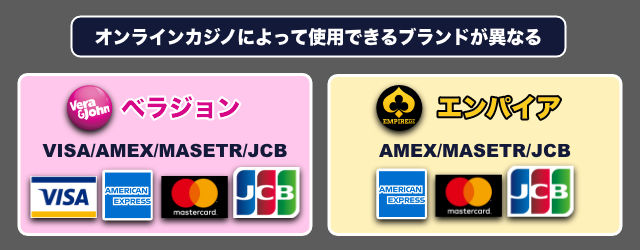 オンラインカジノで使用できるクレジットカードブランドはオンラインカジノごとに異なります。例えばVISA、MasterCardは使えても、JCBは使えないというようにそれぞれで決まっています。