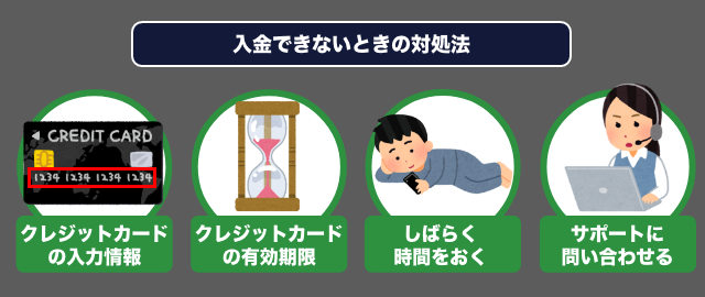 クレジットカードで入金できない場合は、以下対処法を順に行っていってみてください。例外的なトラブルがない限り解決できます。