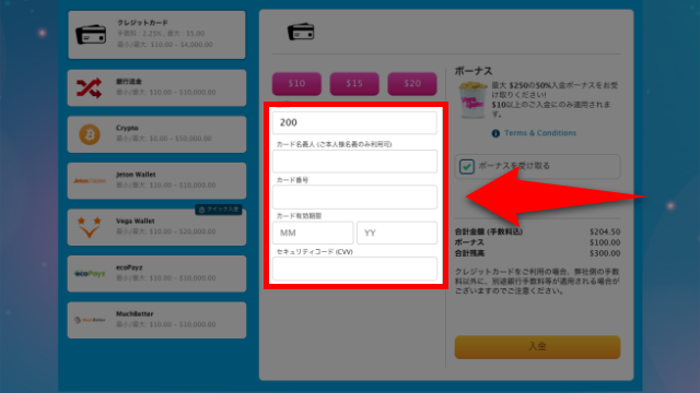 オンラインカジノのクレジットカード(デビットカード)利用例