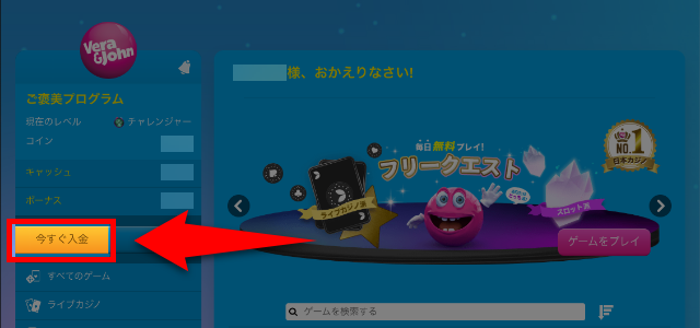 ログインが完了したら、トップ画面右上にある「今すぐ入金」のボタンをクリックします。