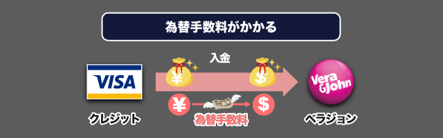 しかし、日本のクレジットカードは決済の基準通貨が日本円(JPY)のため、入金先のオンラインカジノのアカウント通貨がアメリカドル(USD)など他通貨の場合、為替換算手数料がかかります。