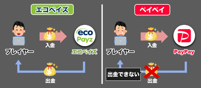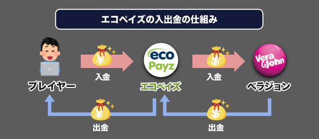 エコペイズの特徴について理解できたところで、エコペイズの入出金の仕組みを理解しておきましょう。エコペイズを使用してオンラインカジノへ入出金する流れは下記の通りです。
