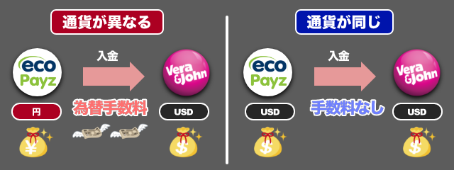 エコペイズの手数料をできるだけ安くしたい!ということであれば、エコペイズ口座の通貨と利用先のオンラインカジノのアカウント通貨を同じものにしましょう。
