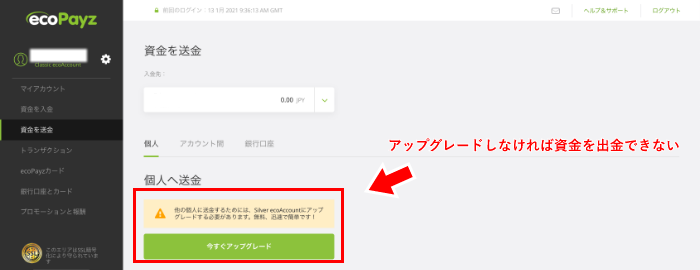 ご覧の通り、Classicランクの場合だけ、他方のエコペイズアカウントの送金すると1.50% (最低額 0.50 EUR)の送金手数料がかかります。