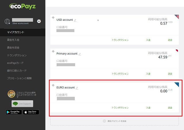 日本語対応オンラインカジノの多くは日本円(JPY)またはアメリカドル(USD)で遊べるので、エコペイズで2つの通貨アカウントを使ってオンラインカジノによって使い分けるようにすることをオススメします。通貨アカウントの追加は無料でできますよ。