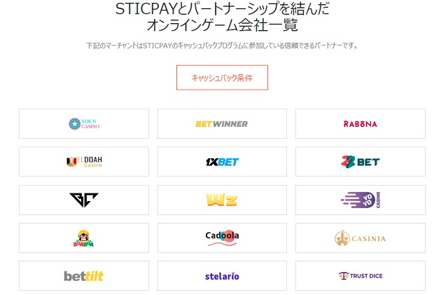 スティックペイは多くのオンラインカジノとパートナーシップを結び、対象会社への入金でスティックペイを利用するとキャッシュバックを受けられるサービスを提供しています。