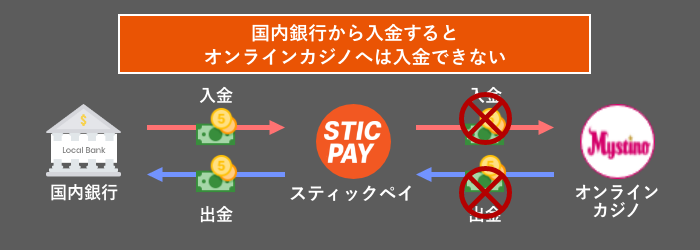 ただし、オンラインカジノでスティックペイを利用する場合は、国内銀行送金で入金しないでください。注意国内銀行送金で振り込んだ資金はオンラインカジノに送金できません。スティックペイに入金する際はクレジットカードか仮想通貨のご利用をオススメします!