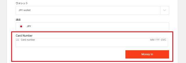 Card Numberにカード番号、有効期限(月 / 年)、3桁のセキュリティコード(CVC)を入力してください。最後に「Money In」をクリックすれば、クレジットカード入金手続きは完了です