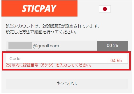 すると、認証コード入力欄が表示されます。認証コードの入力期限は2分以内です。
