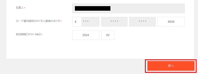 画像をアップロードし終えたら、提出したカードの名義(ローマ字)、カード番号(最初の1桁と最後の4桁)、有効期限(年 / 月)を入力し、「次」へをクリックします。